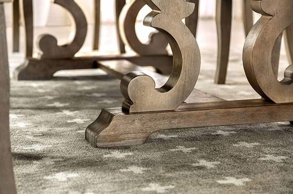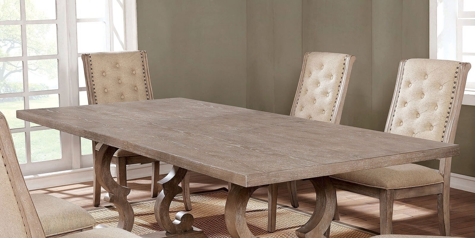 Your dining area says something about you, and this dining collection says that you're welcoming, warm, and generous. The soft natural tone finish of the wood is enough to put anyone at ease, but combined with a button tufted chair, you'll have friends and family relaxed and enjoying their meal for hours. The trestle table base is delicately curved and offers your relaxed aura a touch of sophistication and class without being too intimidating.